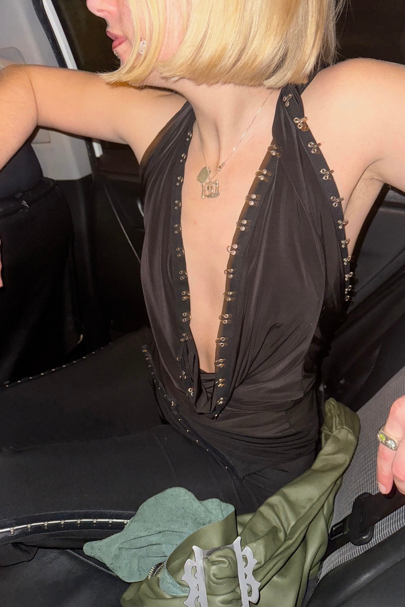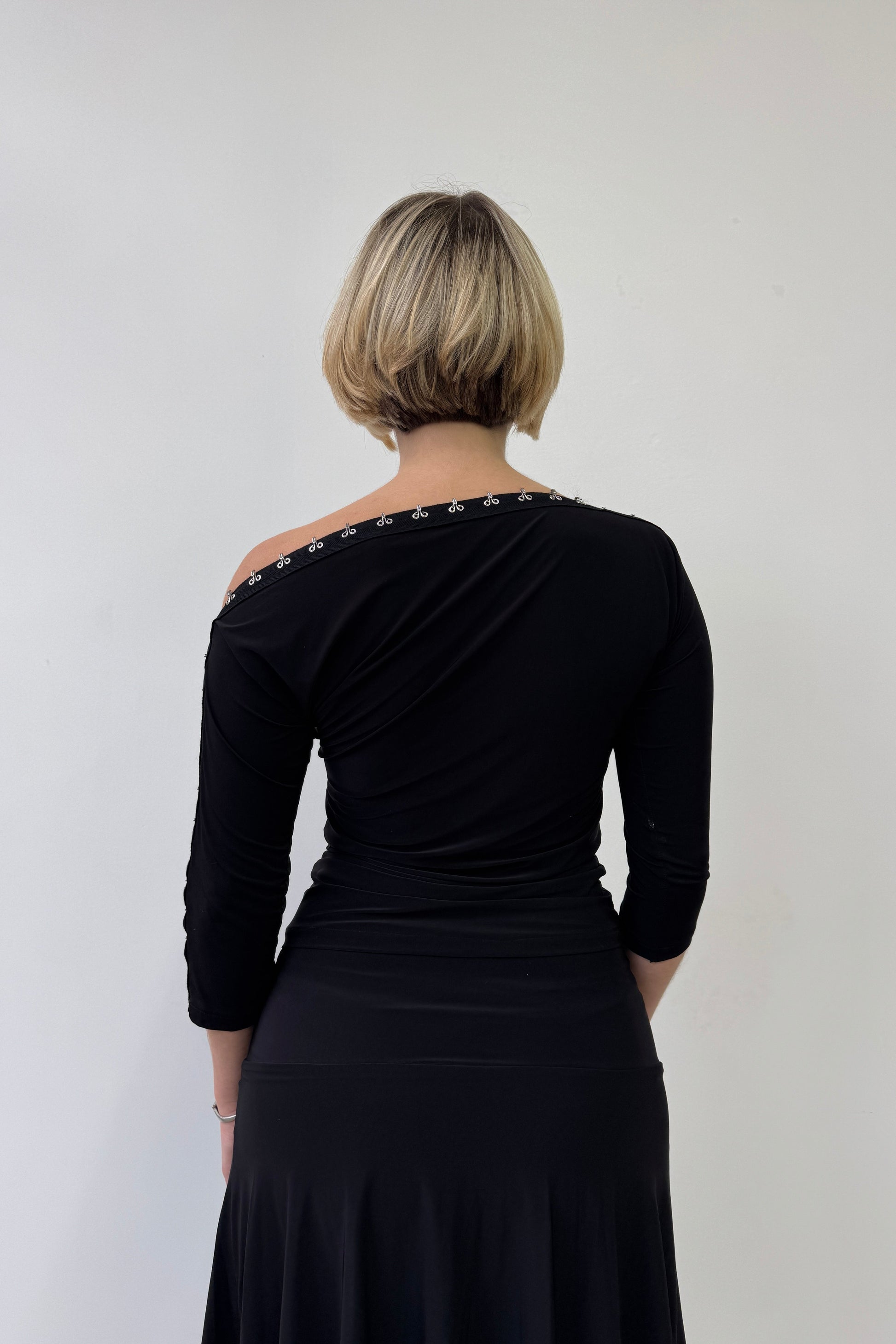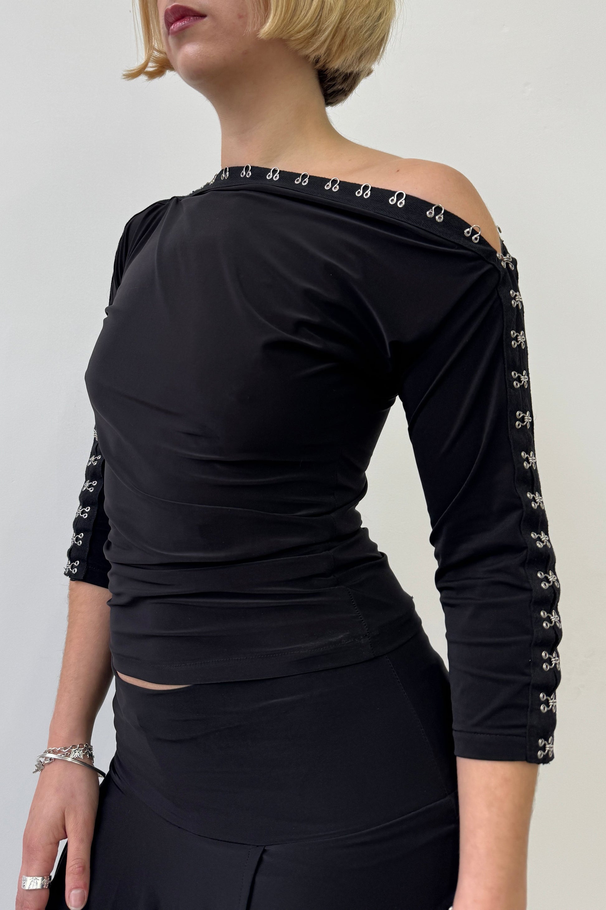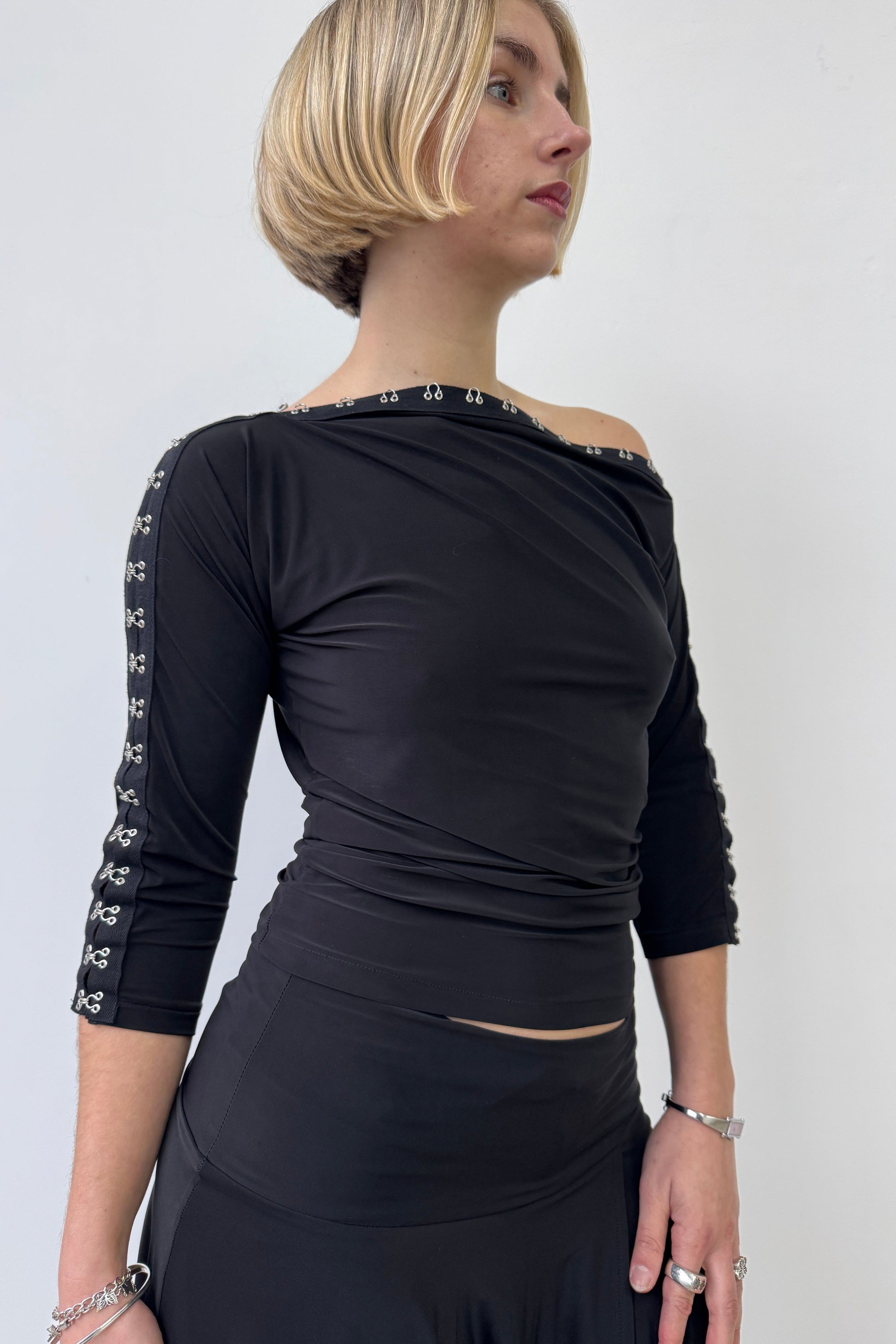 Our best selling Hooked top features cuff to cuff industrial style hook & eye, so you can unhook all the way down and create your own shapes. We've loved seeing how many different ways you wear this, including halter neck, one shoulder and open sleeve.