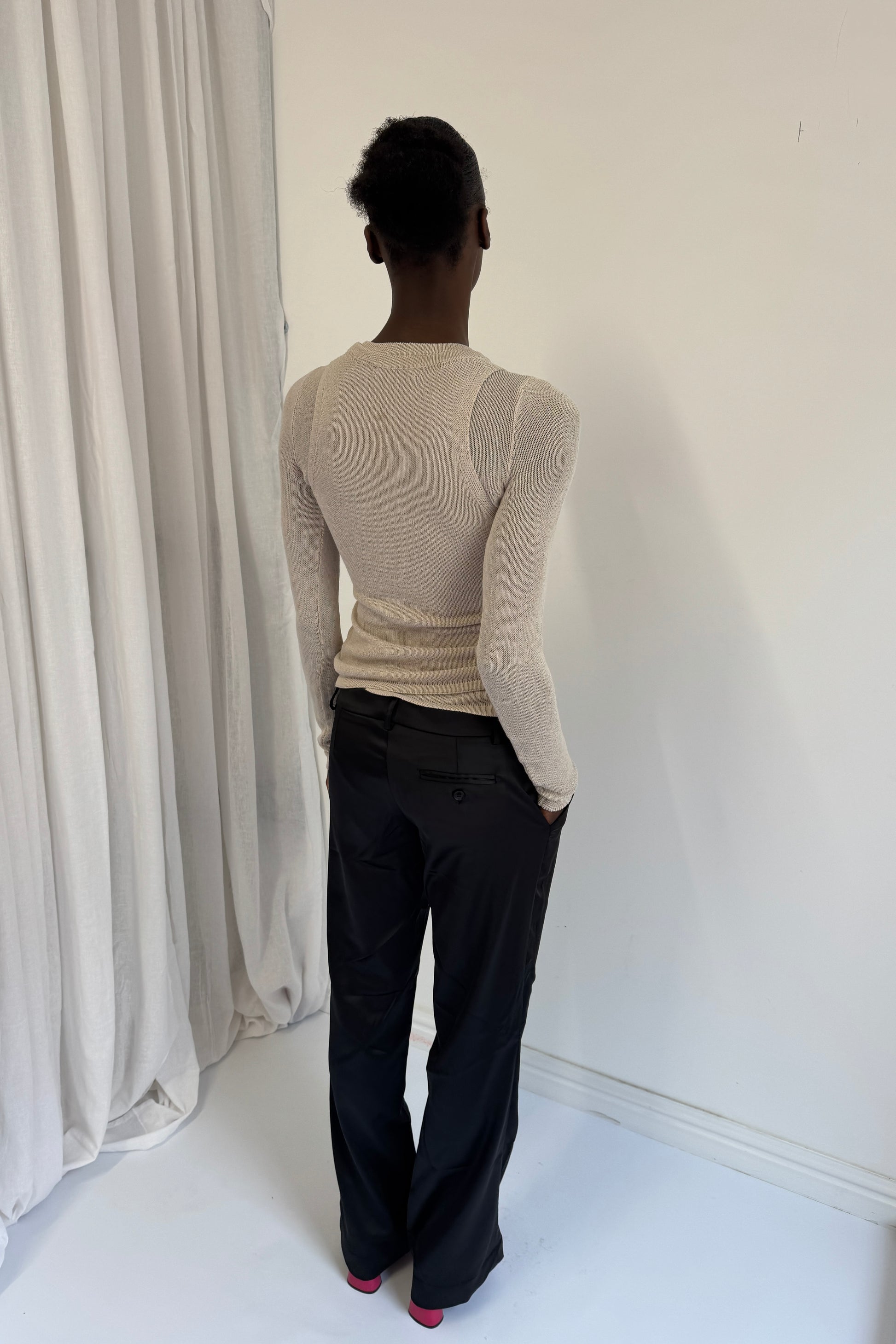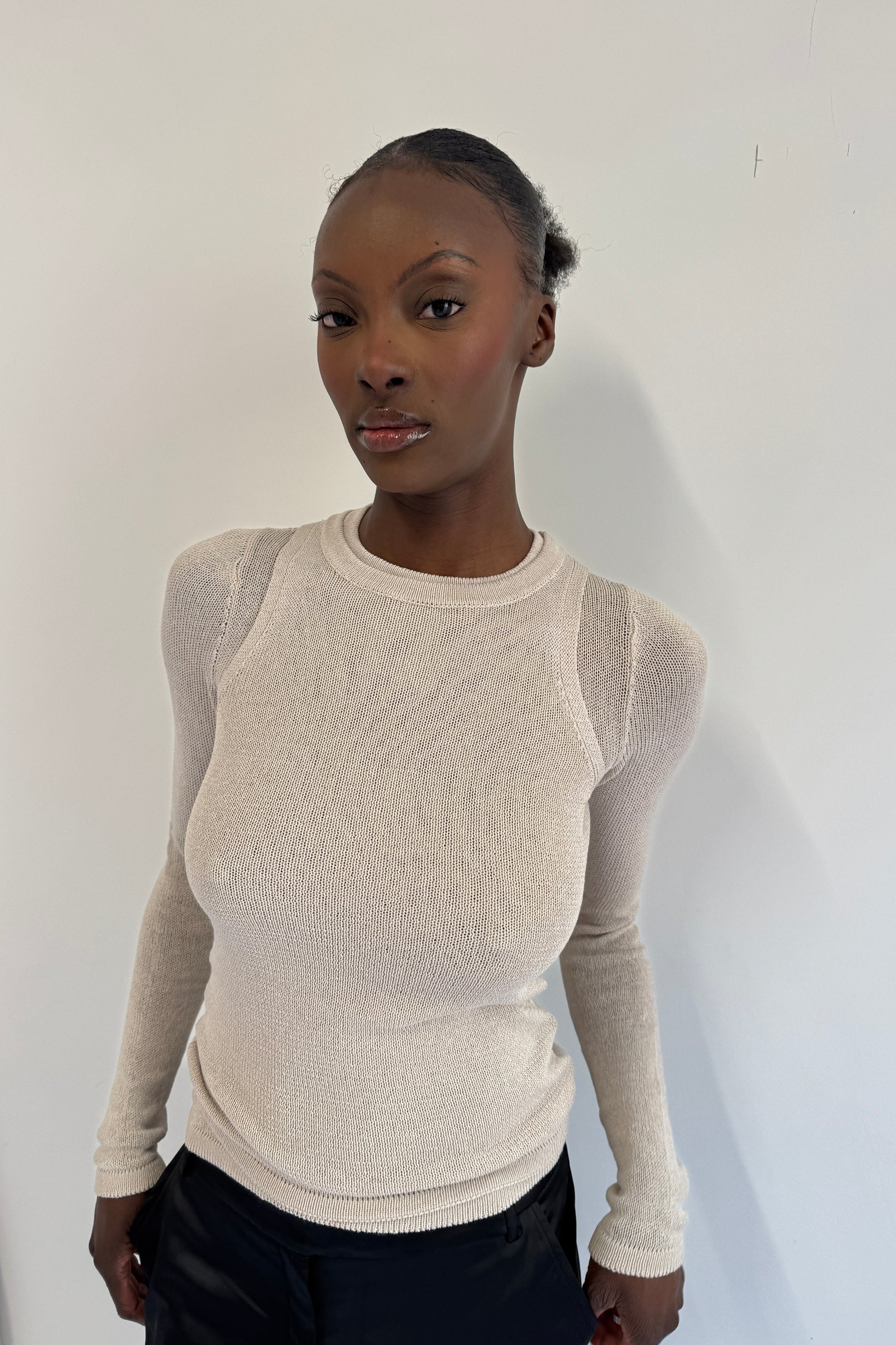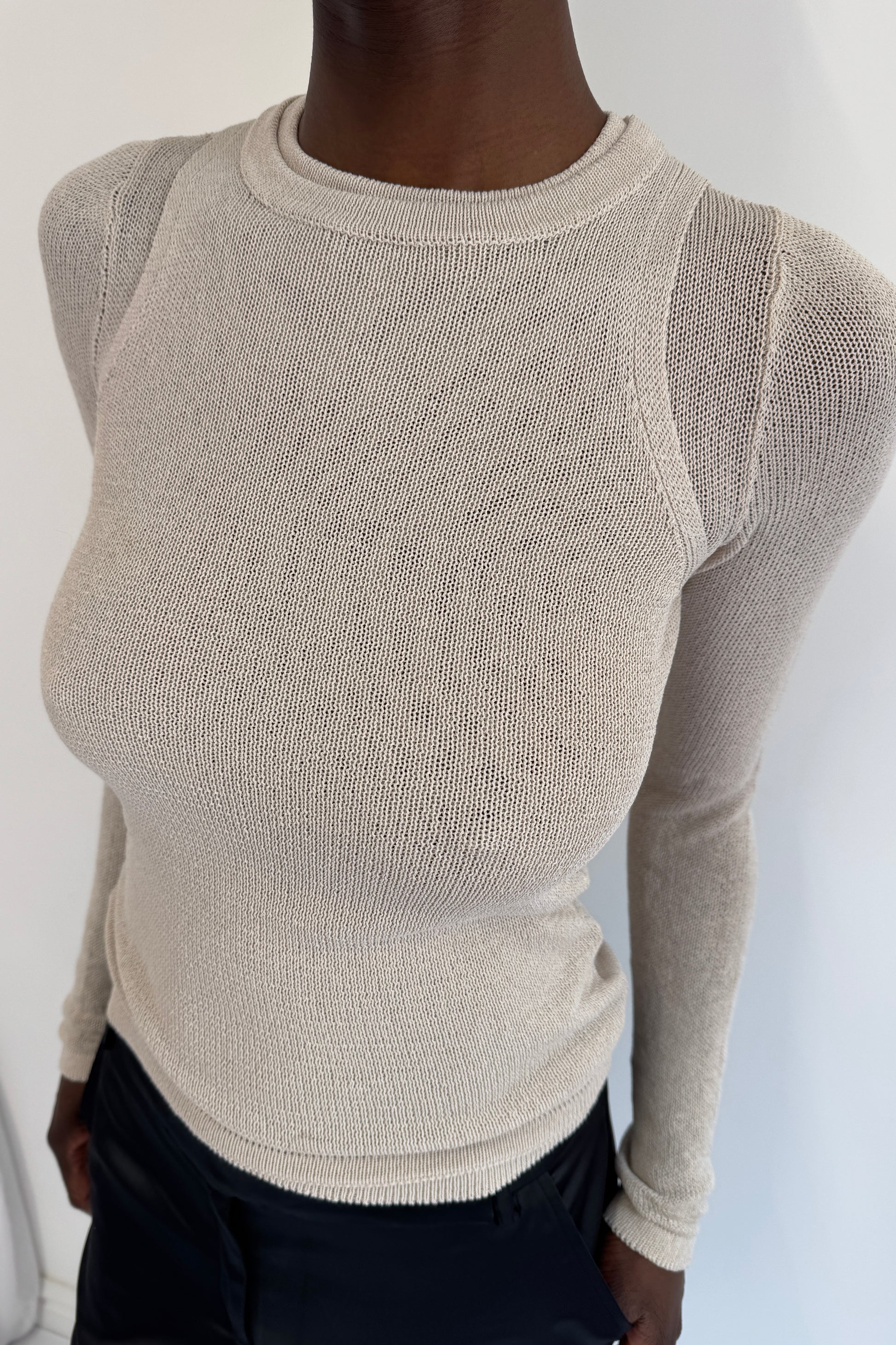 A semi sheer long sleeve top with a crew neckline, and elongated sleeves. Knitted in a soft but structured yarn that hugs curves perfectly whilst holding its shape. Designed to be fitted, and the hem sits on the hips.